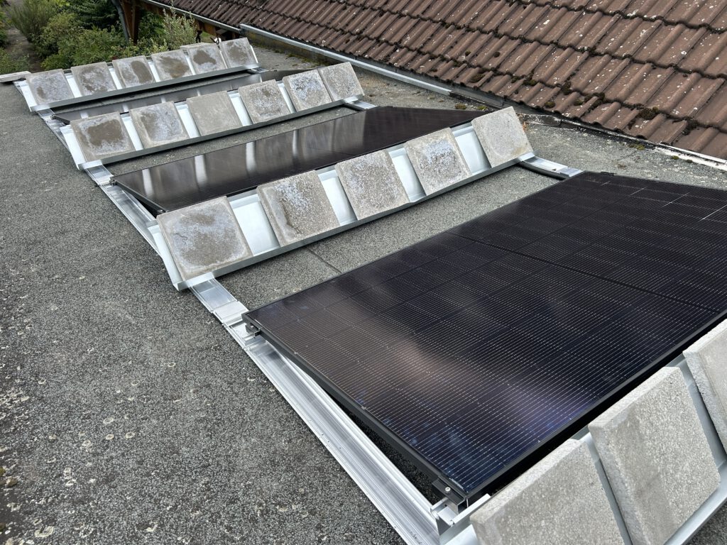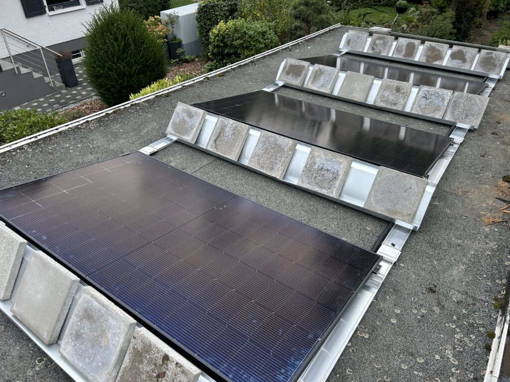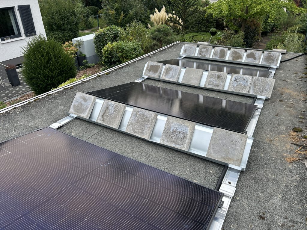 Ein 4-Modul-System bietet dem Wind eine große Angriffsfläche. Billige Systeme müssen oft mit enormen Gewichten beschwert werden, damit sie beim nächsten Herbststurm nicht abheben. Das ist Gift für die Statik vieler Garagen und Carports.